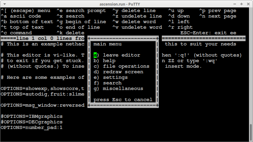На сервере ascension.run редактирование конфигурационного файла происходит прямо в консоли. После успешного Входа (логина) нажмите N для редактирования настроек версии 3.4.3. Для редактирования настроек других вариантов, надо выбрать другую букву в той же колонке.