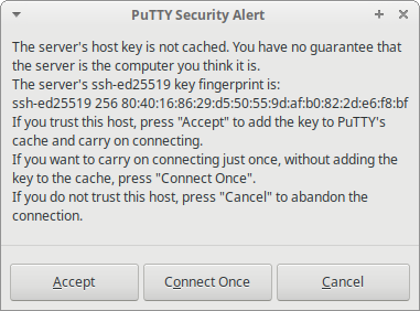 При первом соединении с сервером будет задан вопрос о нашем ему доверии. Принимаем – Accept.