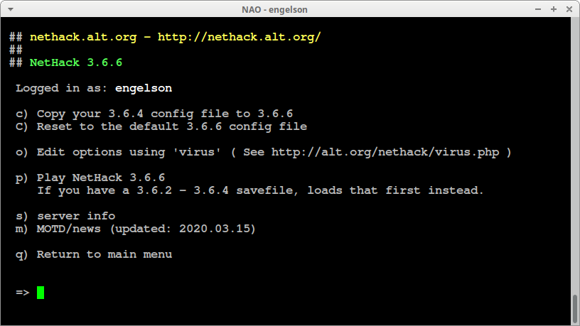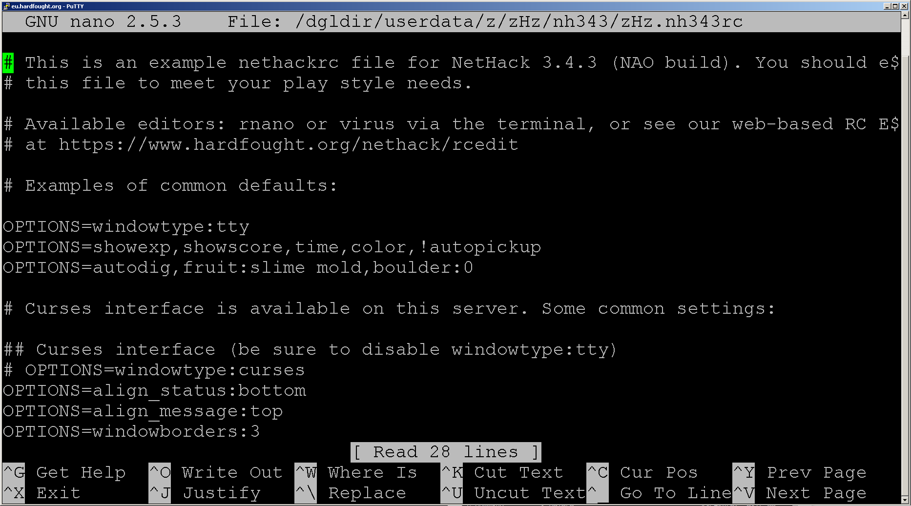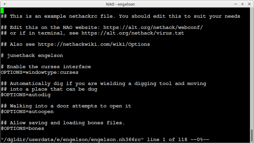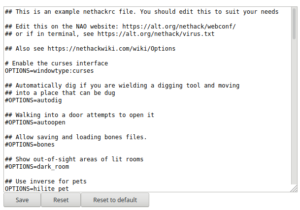 Так же, как и в локальном варианте, в серверной игре есть возможность задавать настройки в конфигурационном файле, хранящимся в вашем профиле на сервере. Тонкости настроек выходят за рамки этой статьи, с ними можно ознакомиться в официальном Руководстве или на сайте NetHackWiki.