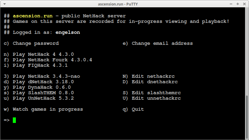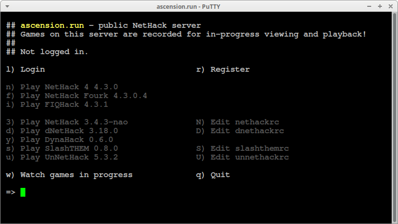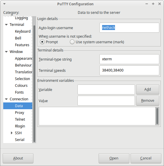 Если всё же попытаться подключиться, то сервер запросит у вас имя пользователя. Это не то имя пользователя, под которым вы будете играть, это другое, стандартное имя. Как правило, надо написать «nethack». Чтобы не вводить это имя каждый раз, его можно сохранить здесь: Connection → Data → Autologin username (Prompt).