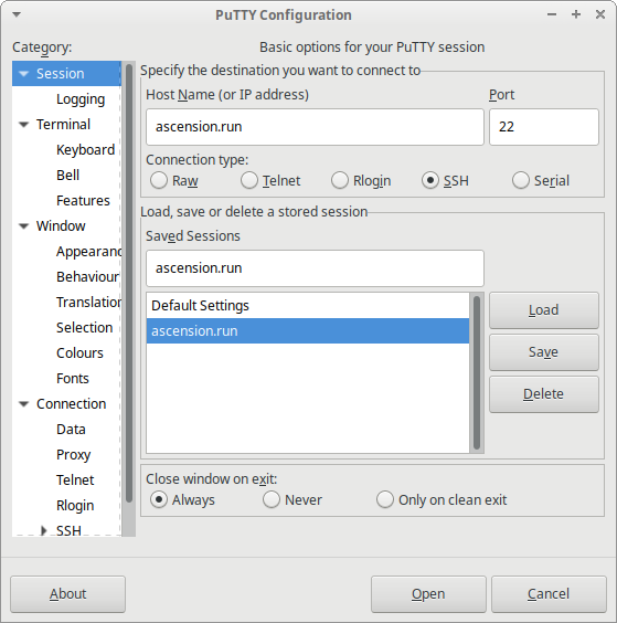 В первом окне в поле Host Name предлагается набрать адрес сервера (в данном примере это ascension.run, тип соединения (SSH), порт (по умолчанию 22)). Также адрес сервера можно написать в поле под надписью Saved Sessions, зачем это делать – будет объяснено позднее. Уже этих настроек достаточно, чтобы подключиться, нажав Open, и посмотреть что получилось, но пока делать этого не будем.