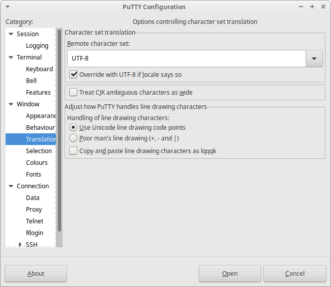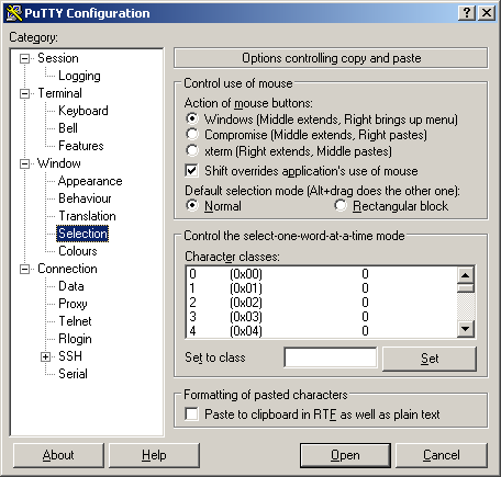 Если вы подключаетесь из под Windows, то очень рекомендую открыть вкладку Window → Selection и в рамке Control use of mouse установить пункт Windows. В противном случае при случайном правом клике по окну с игрой у вас будет автоматически вставляться текст из буфера обмена. Последствия этого для игры могут быть весьма неприятными (DYWYPI?). В Linux такая опция, к сожалению, остутствует.