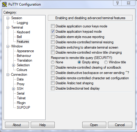 На серверах Hardfought после недавнего обновления, при использовании интерфейса Curses может быть проблема с управлением при помощи NumPad. Решить проблему можно в настройках Putty: Terminal → Features → Disable application keypad mode:
